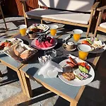 Boendet serverar färska frukter och pannkakor till frukost.